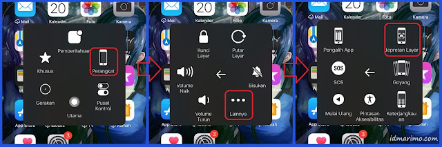 Setelah Assistive Touch aktif akan muncul tombol berwarna putih transparan dilayar. Untuk mengambil screenshot anda bisa melakukannya dengan cara Tekan assistive touch > Perangkat > Lainnya > Jepretan Layar.